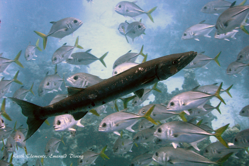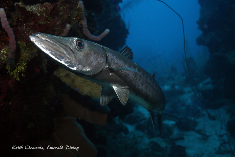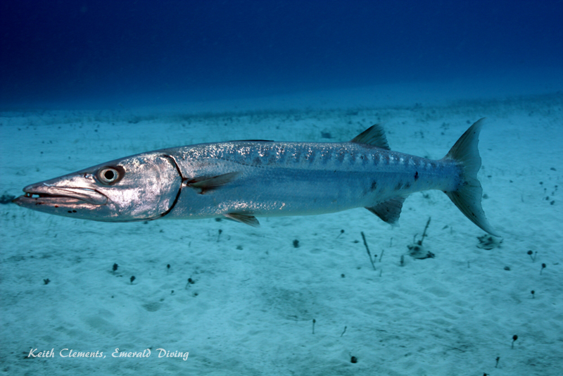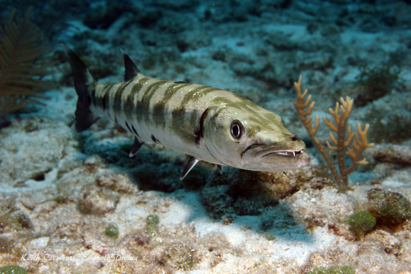 Great Barracuda. The great barracuda in this area were generally small (2-3 feet in length). They are very curious and will approach very close to a quiet and relaxed diver. I had quite a few memorable encounters with great barracuda - they are a very impressive looking fish up close. On a dusk dive, I found a barracuda laying in the sand. It had changed color to match the sand. When it realized I had been watching it, it sprung up and shook its body and instantly changed to silver.