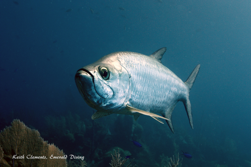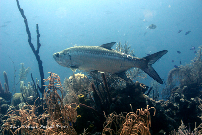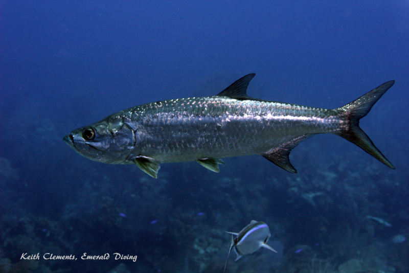 Tarpon. Tarpon look like a huge herring on steroids. They are a seriously powerful looking fish. We had three or four tarpon hang out with us at most of the dive sites at Lighthouse Reef. Theses silver-plated giants tend to rest during the day and hang out above the reef mid-water, then hunt at night. During night dives, they would follow us around and use our lights to spot reef fish. The Tarpon range from 3-4 feet in length. Tarpon are very fun to dive with!