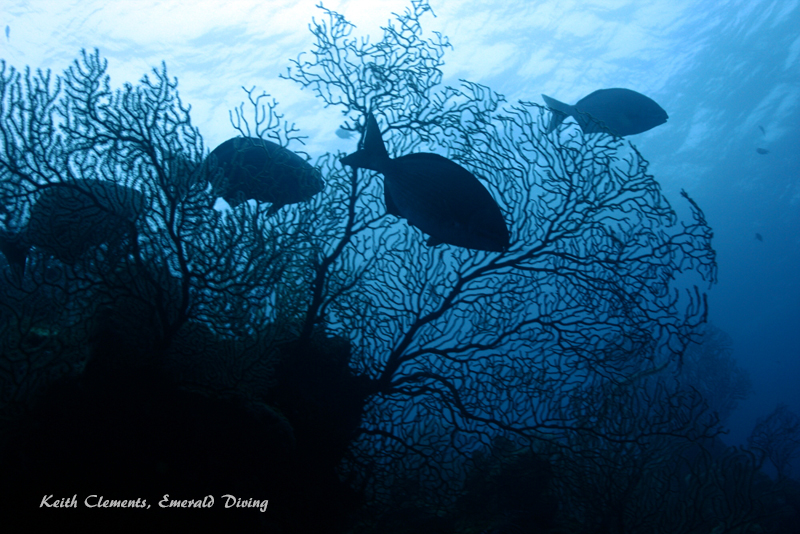 Chubs silhouetted against sea fans