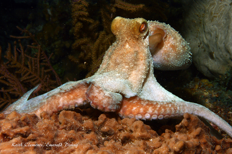 Caribbean octopus and squid. These characters made several night dives for me very memorable. The squid can be quite animated with the bright dive lights - flashing colors, displaying various tentacle configurations and inking on occasion. I found one Caribbean octopus on a night dive which was totally indifferent to my presence. Like our northwest species, these smaller cousins are masters of shape, texture, and color change, but tend to favor brown and a brilliant bright blue color. I spend about 20 minutes watching this octopus hunt at night as it poked in crevices and shrouded small coral formations in search of prey.