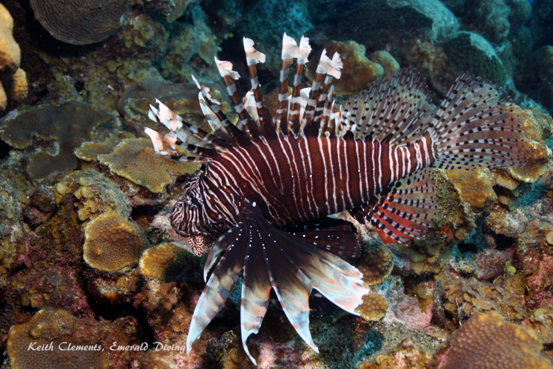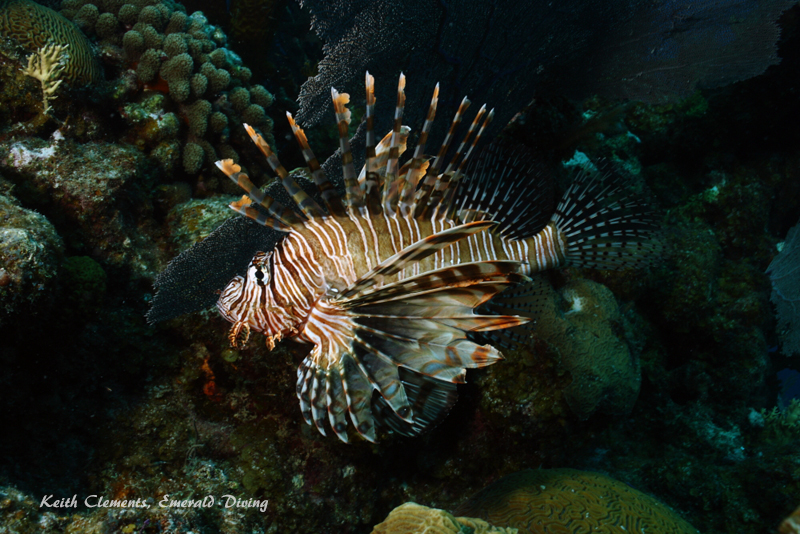 Lionfish - and LOTS of them. I have never seen so many lionfish in an area. A lionfish is often a rare find at many other places I have been to. I saw over 50 on this trip. They often cling to the underside of ledges or caves during the day. During low light and night hours, they were out on the hunt. With no natural enemies, lionfish exhibit beauty and arrogance.