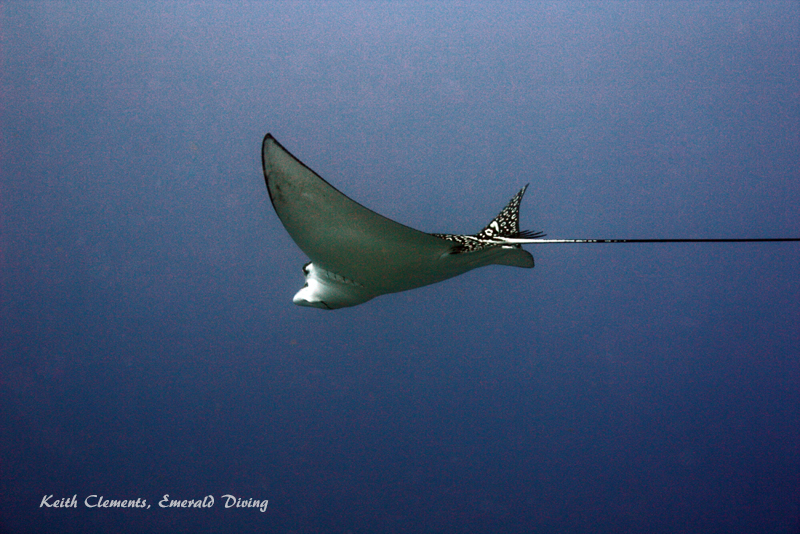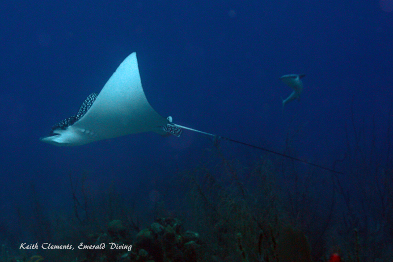Spotted Eagle Rays. When mantas are not around, eagle rays are the next best thing. These rays tended to be somewhat shy and keep their distance - usually 20 feet or more. One actually swam two circles with me before cruising off into the blue. I watched one poor eagle ray being harassed by two sharksuckers (similar to remoras) looking for a free ride, but the eagle ray appeared to be holding its own.