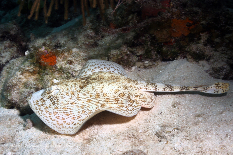 Southern Stingrays. Several of the sites offered expansive sandy stretches. I found southern stingrays at most of these sites, although none really wanted to be approached by a bubble-blowing diver. However, on our dives at Sandy Slope off Turneffe we found juvenile southern stingrays in abundance. I found these rays highly approachable if they were hunting.