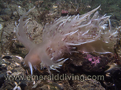 The flamboyant giant nudibranch, Dendrontus iris, hunting tube-dwelling anemones near Pulali Wall