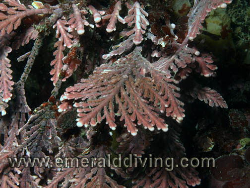 The top of the reef is dominated by kelp, but there are channels within the reef with extensive colonies of proliferation anemones - include some that are shaded blue which is not overly common. The top of the reef also boasts incredible structures of coralline algae.