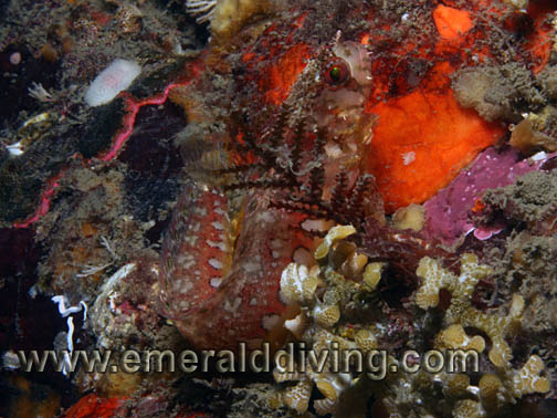 This site can be a mixed bag for fish, but as of 2018 there is a rare resident adult yelloweye rockfish living at this site (and has been here for at least 10 years). Yellowtail, Puget Sound, copper, and quillback rockfish are always present here. On several occasions I have found tiger rockfish, sub-adult and juvenile yelloweye, wolf eel, and some monster lingcod. Painted and kelp greenling are ever-present, as are scalyhead and longfin sculpins and longfin gunnels. This is just an awesome PNW dive site when conditions are right.