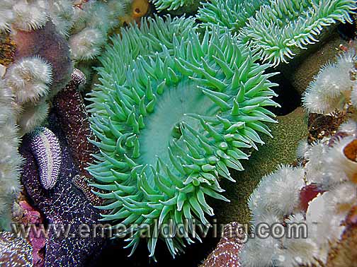 Comments: I only note the green surf anemone in loosely connected groups in shallow rocky areas where surf or surge is prevalent. I do not believe I have noted this speices deeper than 15'. Some of the semi-protected shallows around Tatoosh Island bristle with these anemones.