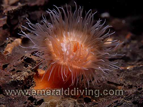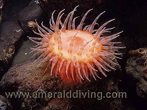 Comments: Swimming anemones are common inhabitant of Washington waters. The amount of orange color can very from animal to animal. This species can actually un-attach from its mount and swim to a new location by undulating its body - a handy trick to use when threatened or the current is not delivering enough nutrients to fulfill the anemones appetitie.