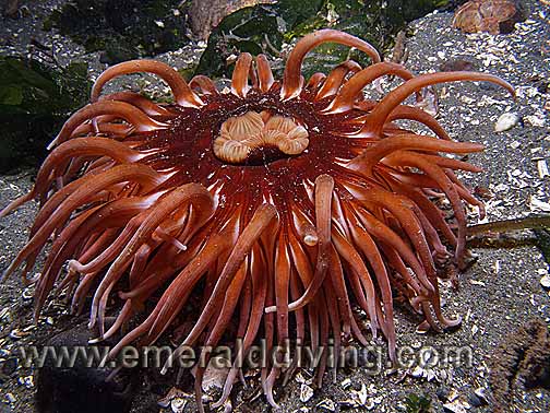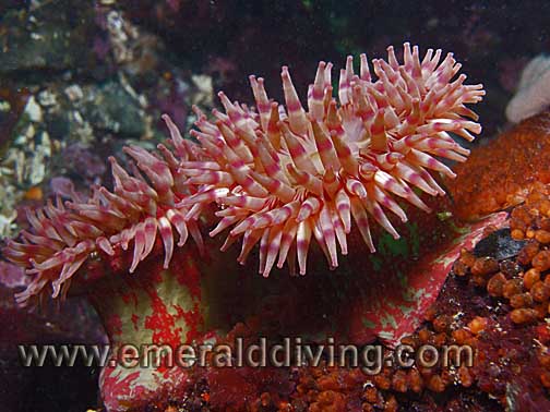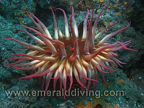 Comments: Large speciemes of the picturesque urticina anemone thrive in rocky, high current areas in the Strait of Juan de Fuca and Cape Flattery. However, they can also be found in Hood Canal. I have seen one specimen as far south as the reef at KVI Tower. Also referred to as a fish eating anemone.