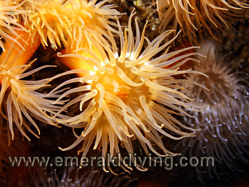 Comments: I typically note these beautiful anemones in shallow waters (less than 10 feet deep) where surge or current is prevalent. A large colony of these anemones resides at Lawrence Point in the San Juan Islands. These anemones almost glow when basking in the sunlight at shallow depths.