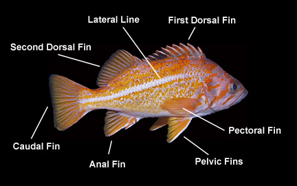 Lateral line: A sensory organ used to sense movement, vibration, and possibly magnetic changes in the water. The laterial line is typically visible in most fish as an off-color line or rough-looking scales that run from behind the gills to the tail.