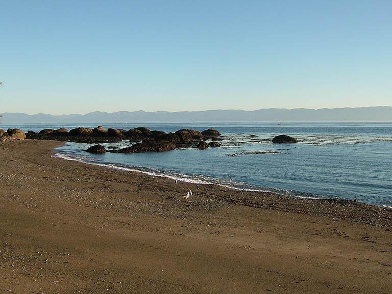 and concrete slab by the breakwater in the gravel parking area. A nice beach lies to the west. I enter the water to the west of the breakwater along this beach.