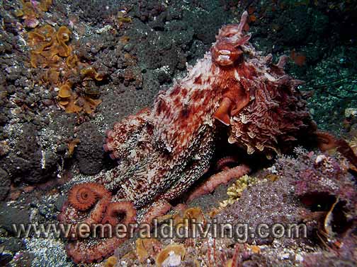 Marine Life: The invertebrate marine life at this site is among the best in the area. The fingers are extremely rich in interesting invertebrates including iophon sponges, grey puffball sponges, orange finger sponges, and opalescent nudibranchs just to name a few. I have seen more wolfeel swimming in the open at this site than at all other sites combined. Giant pacific octopus also hunt this area extensively, an event I have been very fortunate to witness on several occasions.