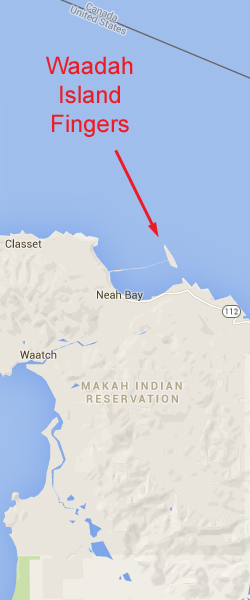 Access by boat: This series of parallel ridges is a continuation of the fingers that characterize the northwest tip of Waadah Island. Waadah Island is situated just outside Neah Bay. The fingers are readily located with a depth sounder by running parallel to the northwest end of Waadah Island and watching the depth of the substrate continually jump up and down.